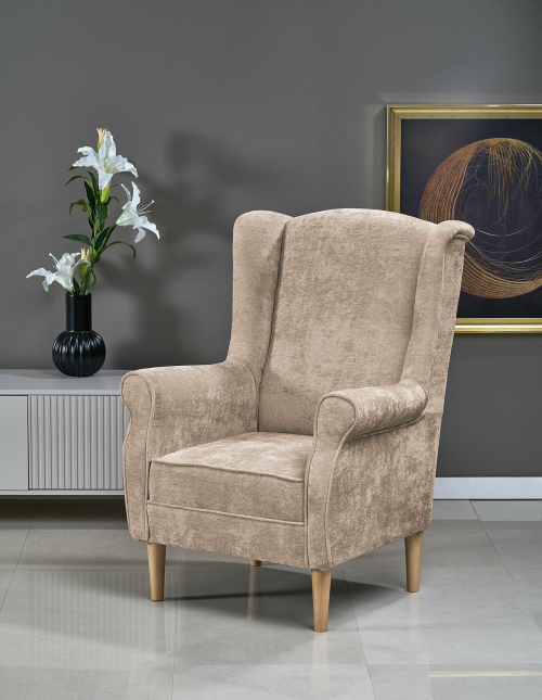 • Ponadczasowy design: Charakterystyczny kształt z wysokim, profilowanym oparciem (tzw. "uszak") i elegancko zaokrąglonymi podłokietnikami nadaje fotelowi wyrafinowanego wyglądu.