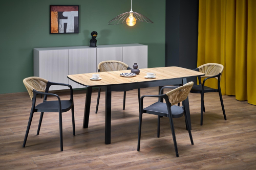 Uniwersalny Design: Połączenie blatu w kolorze dąb artisan z czarnymi nogami sprawia, że stół BARRIL doskonale wpisuje się w różnorodne style wnętrzarskie – od nowoczesnego po skandynawski czy loftowy. -