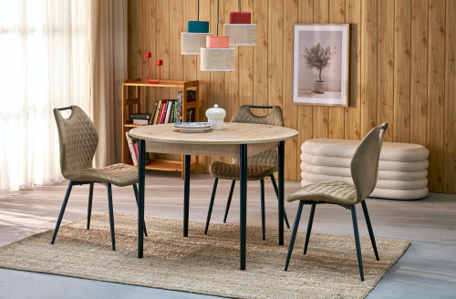 Blat stołu PIVOT wykonany jest z płyty meblowej laminowanej w modnym kolorze dąb artisan, który wprowadzi do Twojego wnętrza naturalny i ciepły akcent. Solidne, lekko skośne nogi wykonane z litego drewna bukowego malowanego na elegancki czarny kolor dodają stołowi nowoczesnego charakteru i zapewniają stabilność konstrukcji.