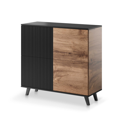 Komoda posiada prosty, geometryczny kształt z czarnymi, lekko skośnymi nóżkami wykonanymi z polipropylenu, które dodają jej wizualnej lekkości. Fronty komody są asymetryczne - po lewej stronie znajdują się dwoje drzwi z charakterystycznym ryflowaniem w kolorze czarnym, natomiast po prawej stronie umieszczono dwoje drzwi w dekorze dębu wotan. Taki układ nadaje meblowi unikalnego charakteru.