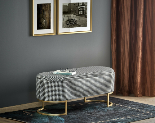ławka z funkcją pojemnika, wymiary: 105/40/42 cm, materiał: tkanina / stal malowana proszkowo, kolor: czarny - biały - złoty