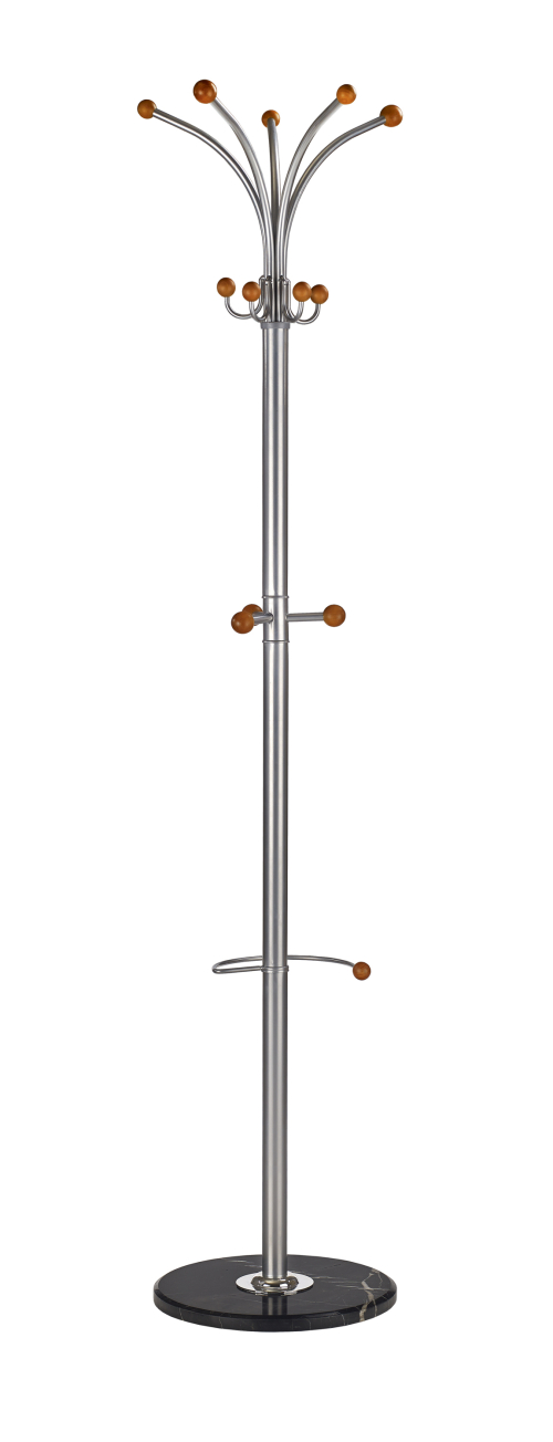Srebrny kolor wieszaka w połączeniu z ciepłymi drewnianymi elementami nadaje mu wyjątkowego charakteru, doskonale wpisując się w stylistykę nowoczesnego skandynawskiego designu oraz minimalizmu. Dodatkowo, wieszak został wyposażony w liczne haczyki, co zapewnia wygodną organizację odzieży, toreb i innych akcesoriów. Dzięki swojej starannie przemyślanej konstrukcji, wieszak W46 będzie w stanie pomieścić wiele rzeczy, a jego stabilna, kamienna podstawa zapewnia pewność użytkowania.