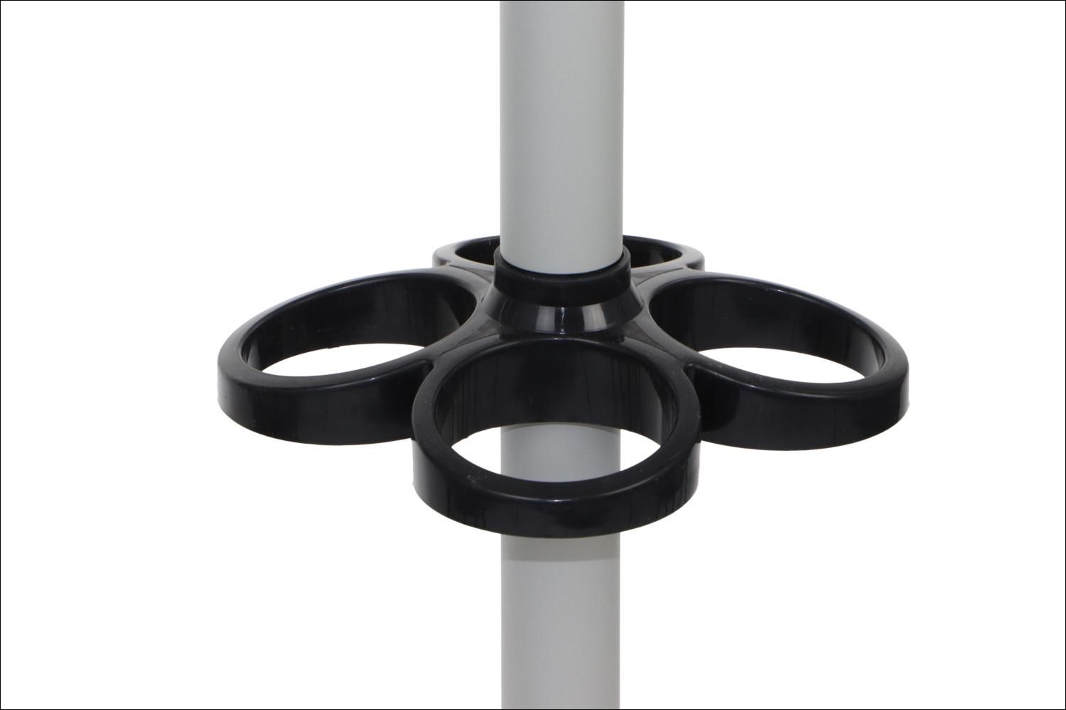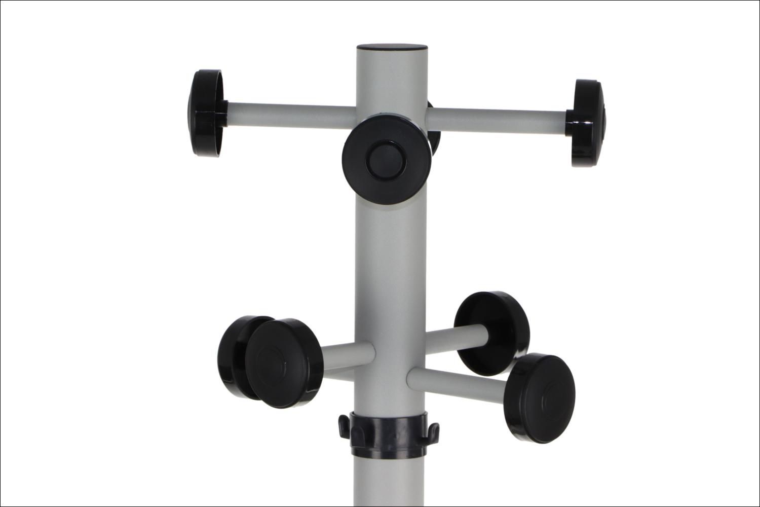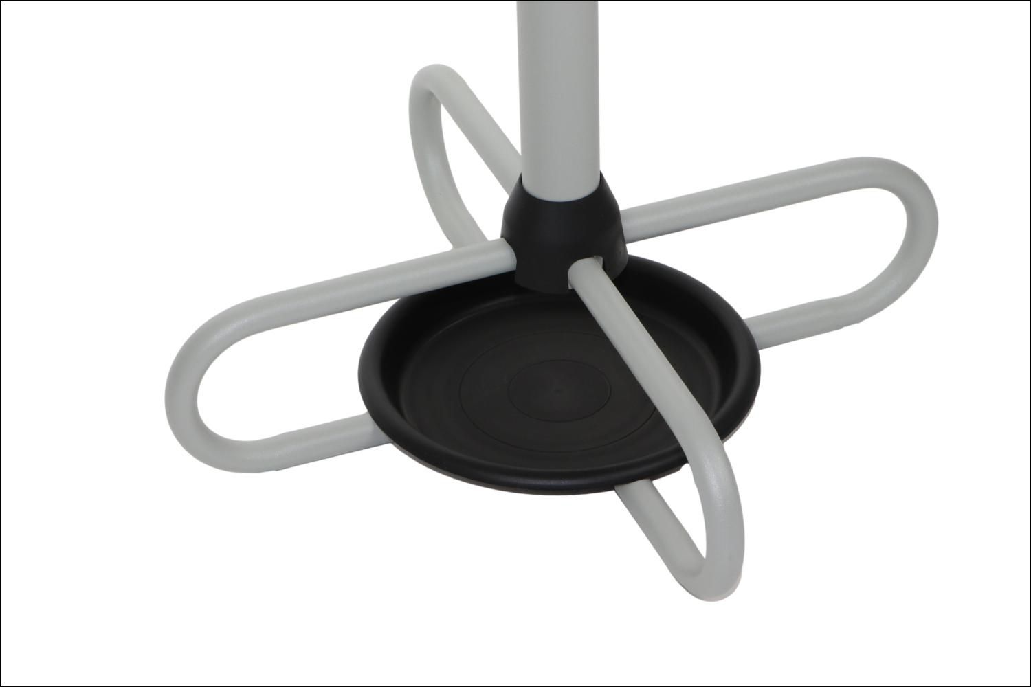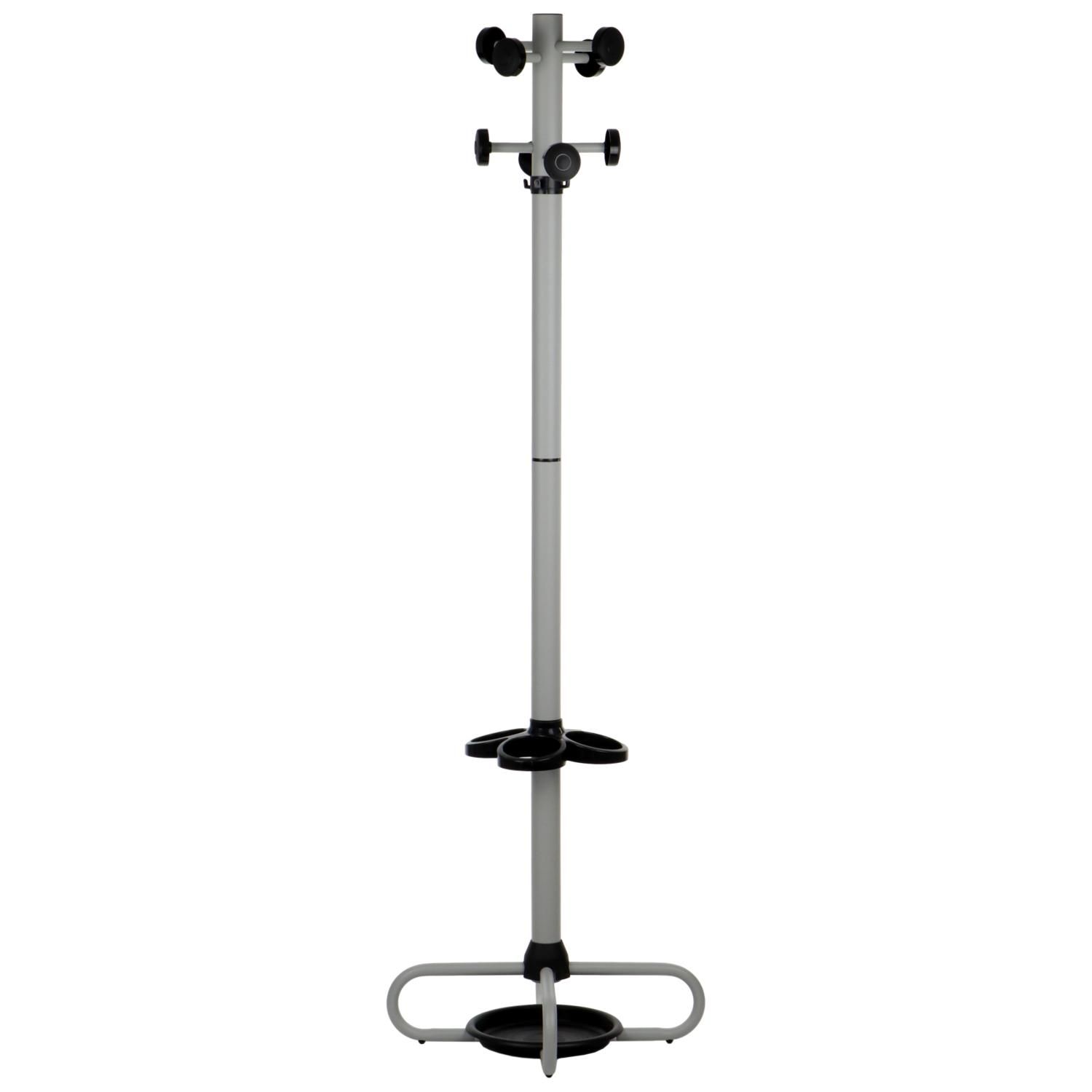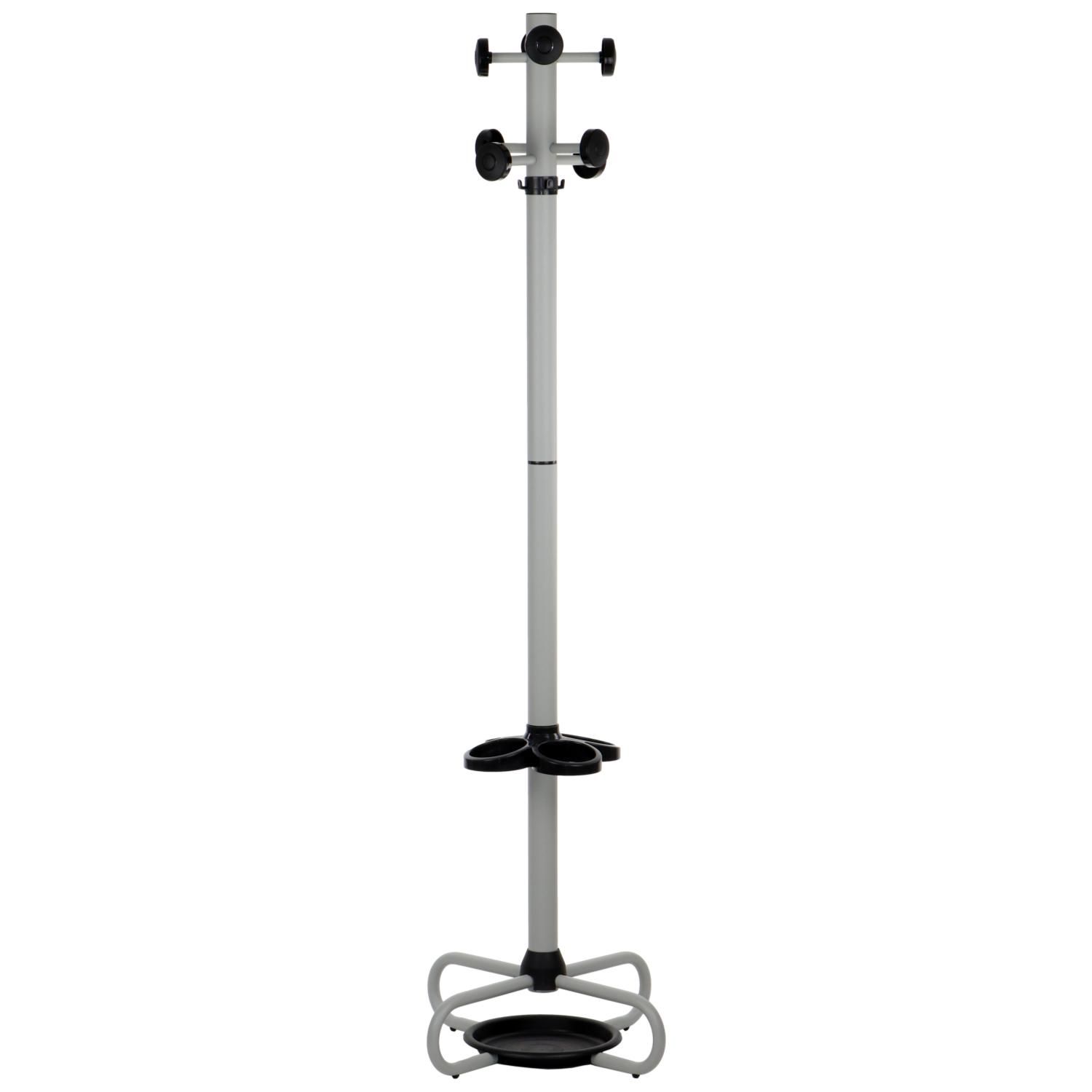 Wieszak stojący w kolorze szarym z dodatkami w kolorze czarnym, wyposażony w obrotową "koronę" ułatwiająca dostęp do ubrań, miejsce na parasole z ociekaczem.