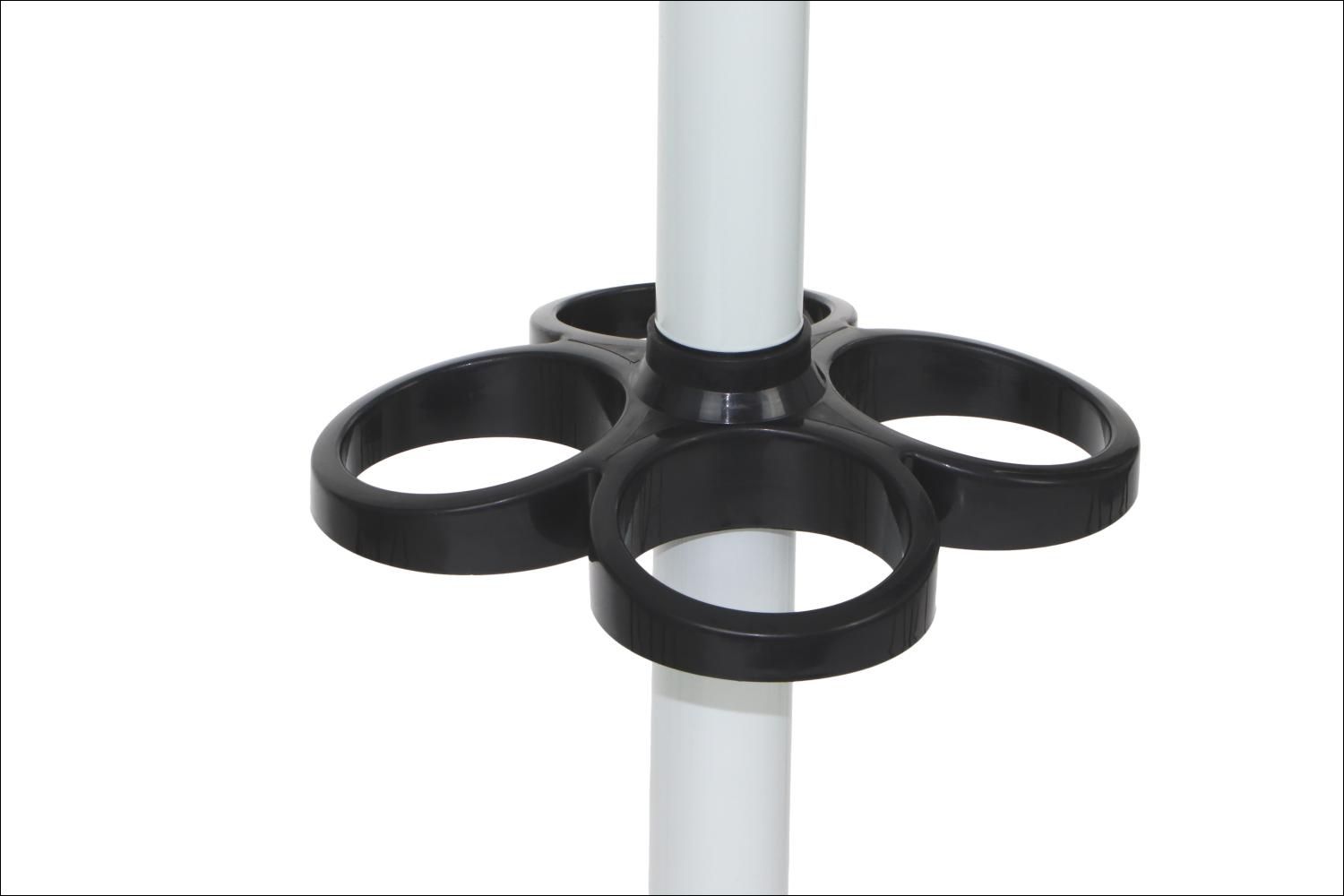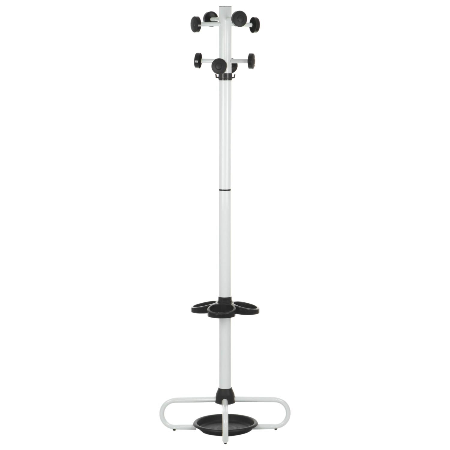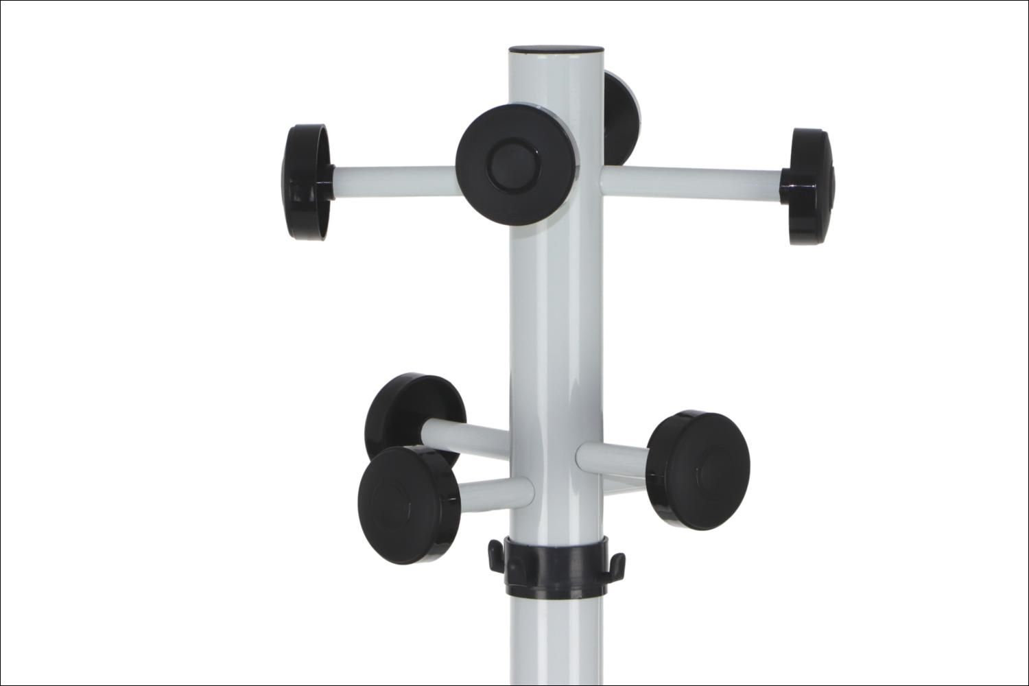 Wieszak stojący w kolorze białym z dodatkami w kolorze czarnym, wyposażony w obrotową "koronę" ułatwiająca dostęp do ubrań, miejsce na parasole z ociekaczem.