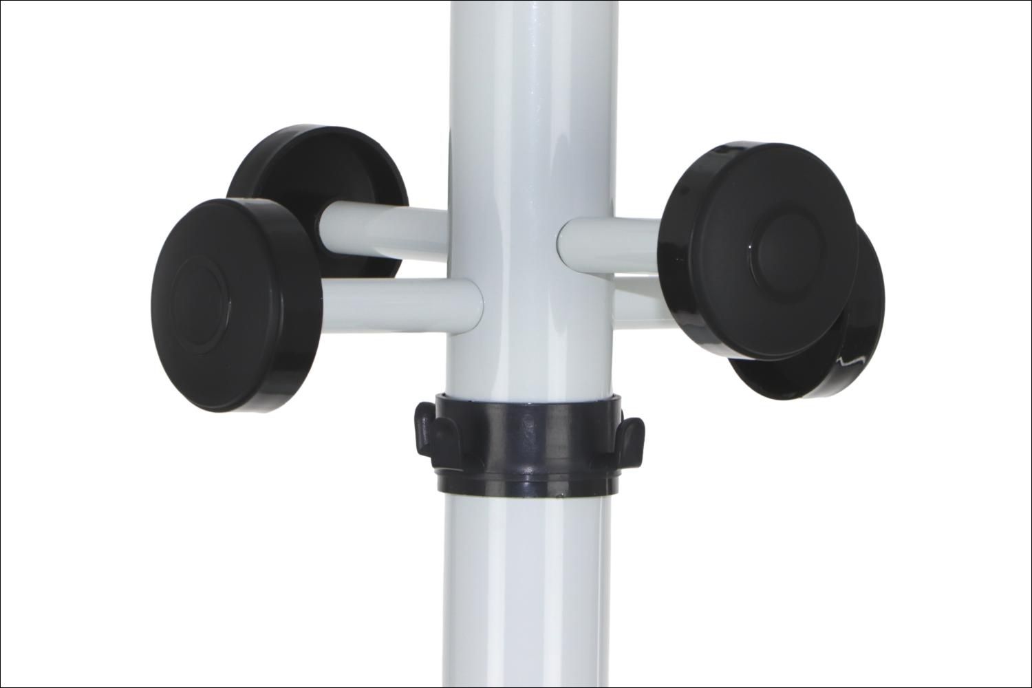 Wieszak stojący w kolorze białym z dodatkami w kolorze czarnym, wyposażony w obrotową "koronę" ułatwiająca dostęp do ubrań, miejsce na parasole z ociekaczem.